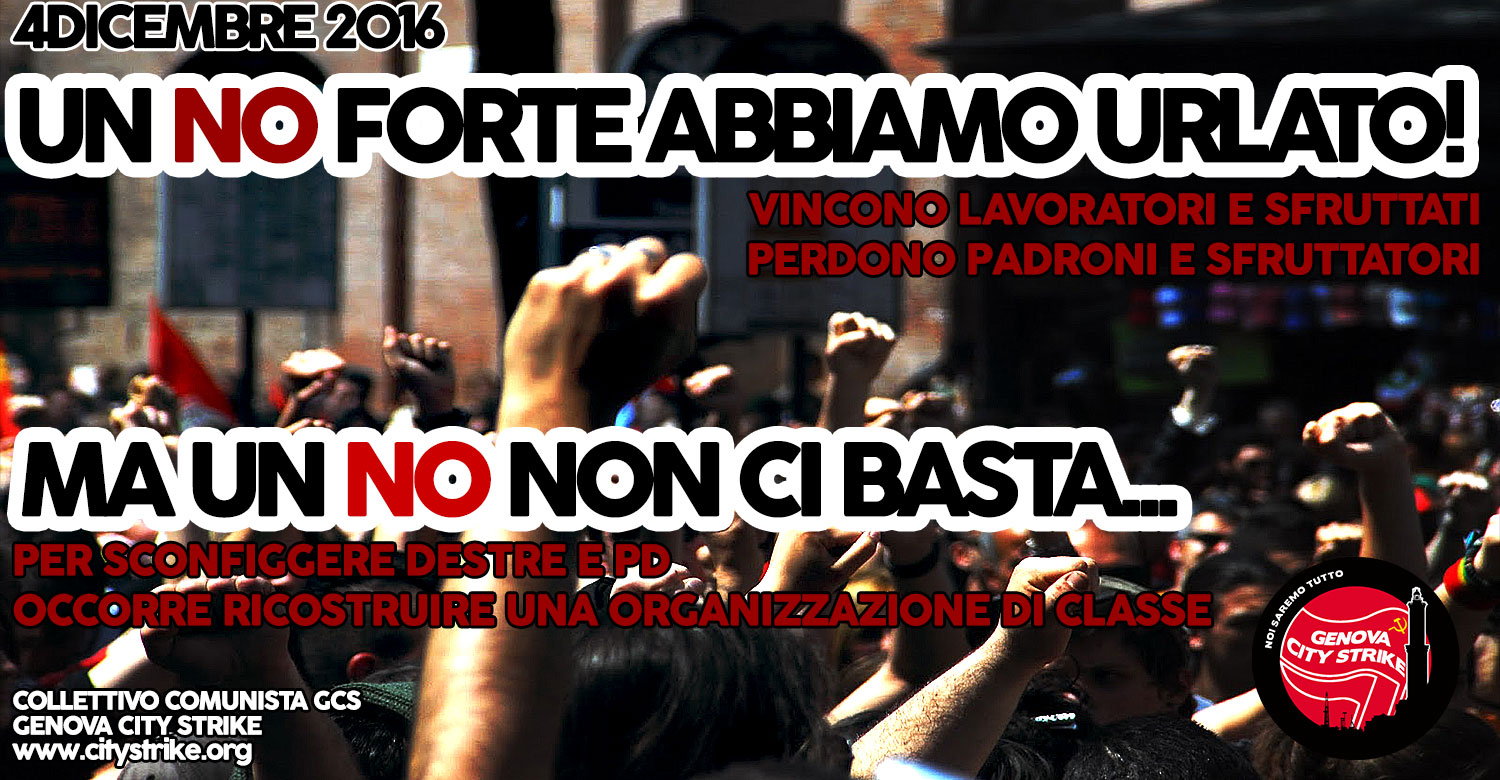 Nei mesi più caldi dell’estate scrivemmo un testo che annunciava l’avvio di una battaglia di classe contro la riforma istituzionale. In quel periodo del referendum non parlava nessuno se non un ristretto gruppo di giuristi che, correttamente, mettevano in guardia nei confronti di una riforma pasticciata e illeggibile. A livello politico infuriava un dibattito all’interno del PD, totalmente strumentale, tra Renzi e la vecchia guardia degli sconfitti (Bersani, D’Alema etc…) Di queste cose ce ne importava veramente poco ma avevamo capito che dietro lo spettacolo indegno del PD si agitava una battaglia reale e concreta che riguardava il futuro dell’Italia e di milioni di lavoratori. Quasi contemporaneamente, nella sinistra di classe lacerata e confusa si faceva avanti un ragionamento molto simile. Il punto dirimente era cercare di capire perché Renzi e i suoi alleati volessero distruggere la Costituzione (almeno ciò che di essa rimane vivo) e, per farlo, si imbarcassero in una battaglia che poteva essere difficile e a rischio.