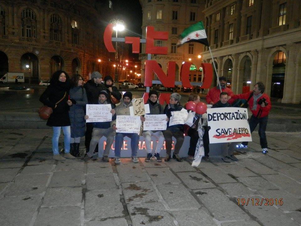 Nonostante la pubblicità sui giornali, l’appoggio del PD e dei mezzi di informazione, solo poche decine di presenti oggi (lunedì 19 dicembre 2016) in Piazza De Ferrari nel presidio per Aleppo. Dove si è vista sventolare la bandiera dei ribelli siriani (quella con tre stelle) e si inalberavano cartelli con scritto Assad = Hitler. Gli organizzatori erano l’ARCI con altre associazioni e partecipavano anche il Comune e il PD. Non sappiamo quanti e quante in buona fede fossero presenti in piazza e che cosa hanno pensato. Certo che è curioso che la manifestazione fosse in contemporanea all’assassinio dell’ambasciatore russo in Turchia da parte di un estremista islamico.